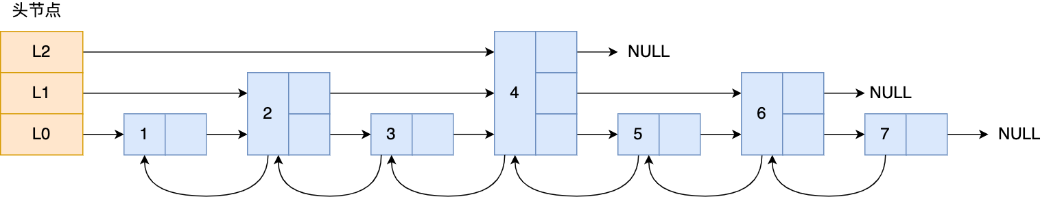 图中头节点有 L0~L2 三个头指针,分别指向了不同层级的节点,然后每个层级的节点都通过指针连接起来: