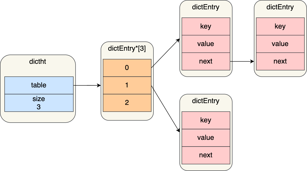 } dictEntry;dictEntry 结构里不仅包含指向键和值的指针,还包含了指向下一个哈希表节点的指针,这个指针可以将多个哈希值相同的键值对链接起来,以此来解决哈希冲突的问题,这就是链式哈希。